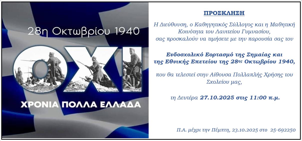 Ενδοσχολικός Εορτασμός 28ης Οκτωβρίου - Πρόσκληση