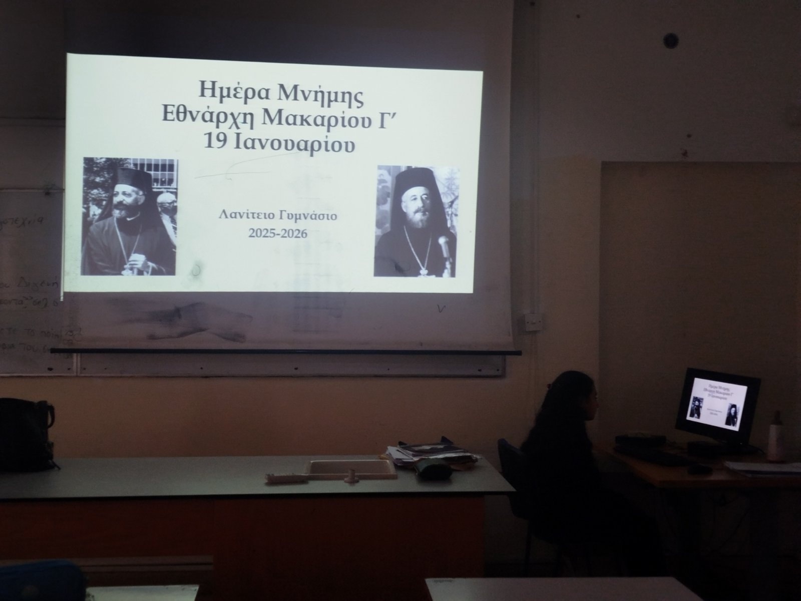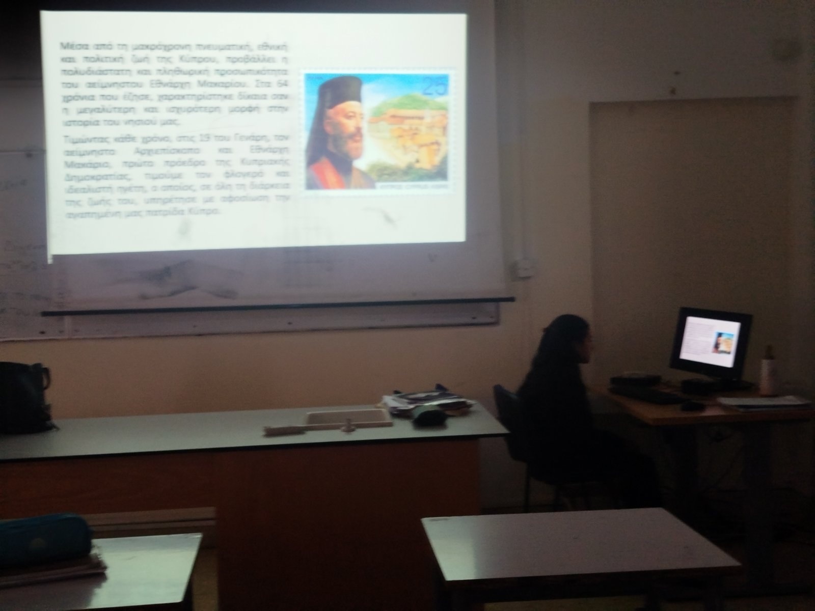 Στις 19 Ιανουαρίου πραγματοποιήθηκε ενδοτμηματική εκδήλωση, κατά τη διάρκεια της οποίας παρουσιάστηκαν οι κύριοι σταθμοί της ζωής του Αρχιεπισκόπου Μακαρίου Γ'. Τονίστηκε το έργο του κατά τον αγώνα 1955 - 1959 εναντίον των Άγγλων, την ανεξαρτησία της Κύπρου και το πραξικόπημα.Την επιμέλεια της εκδήλωσης ανέλαβε η Φιλόλογος κυρία Χριστίνα Γενεθλίου.