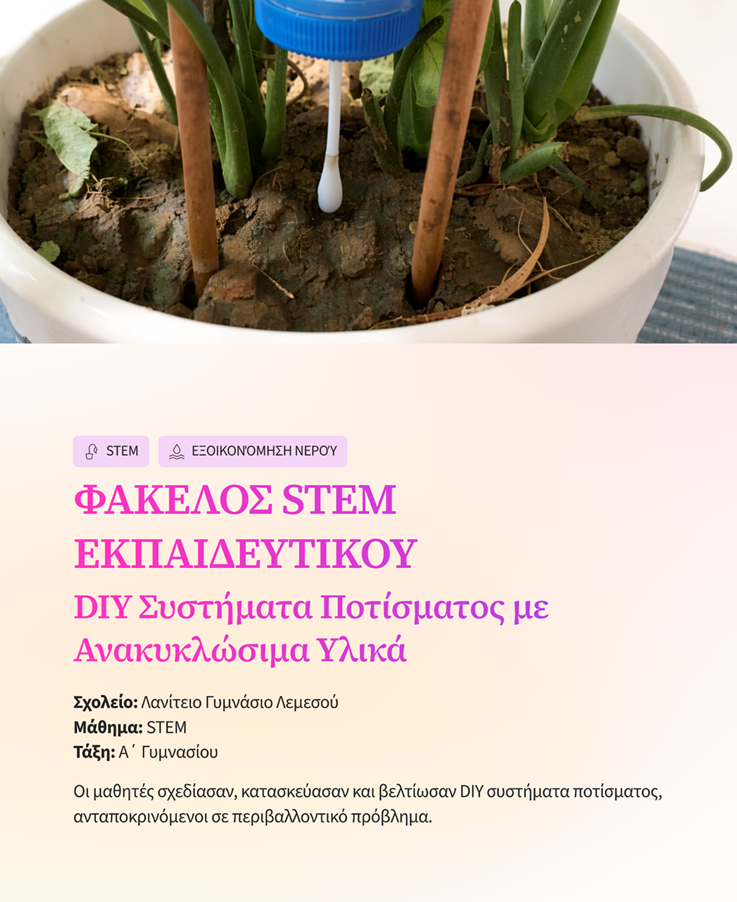 Το παρόν STEM project υλοποιείται στο πλαίσιο της μαθητοκεντρικής, βιωματικής και διερευνητικής μάθησης που προωθεί το Υπουργείο Παιδείας, Αθλητισμού και Νεολαίας Κύπρου.